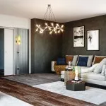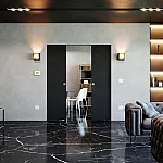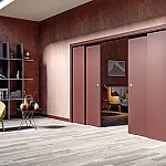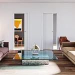 Sliding door system Arkimede Doppio by Ermetika offers the possibility to build in a double sliding door in a curved plasterboard wall, creating an exclusive and elegant look to the passage between two rooms.