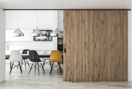 Doordat het ophangsysteem in de schuifdeur komt, komt de deur dicht tegen de schuifdeurrail aan. Dit heeft een mooie en minimalistische look waardoor een extra afwerking niet nodig is.